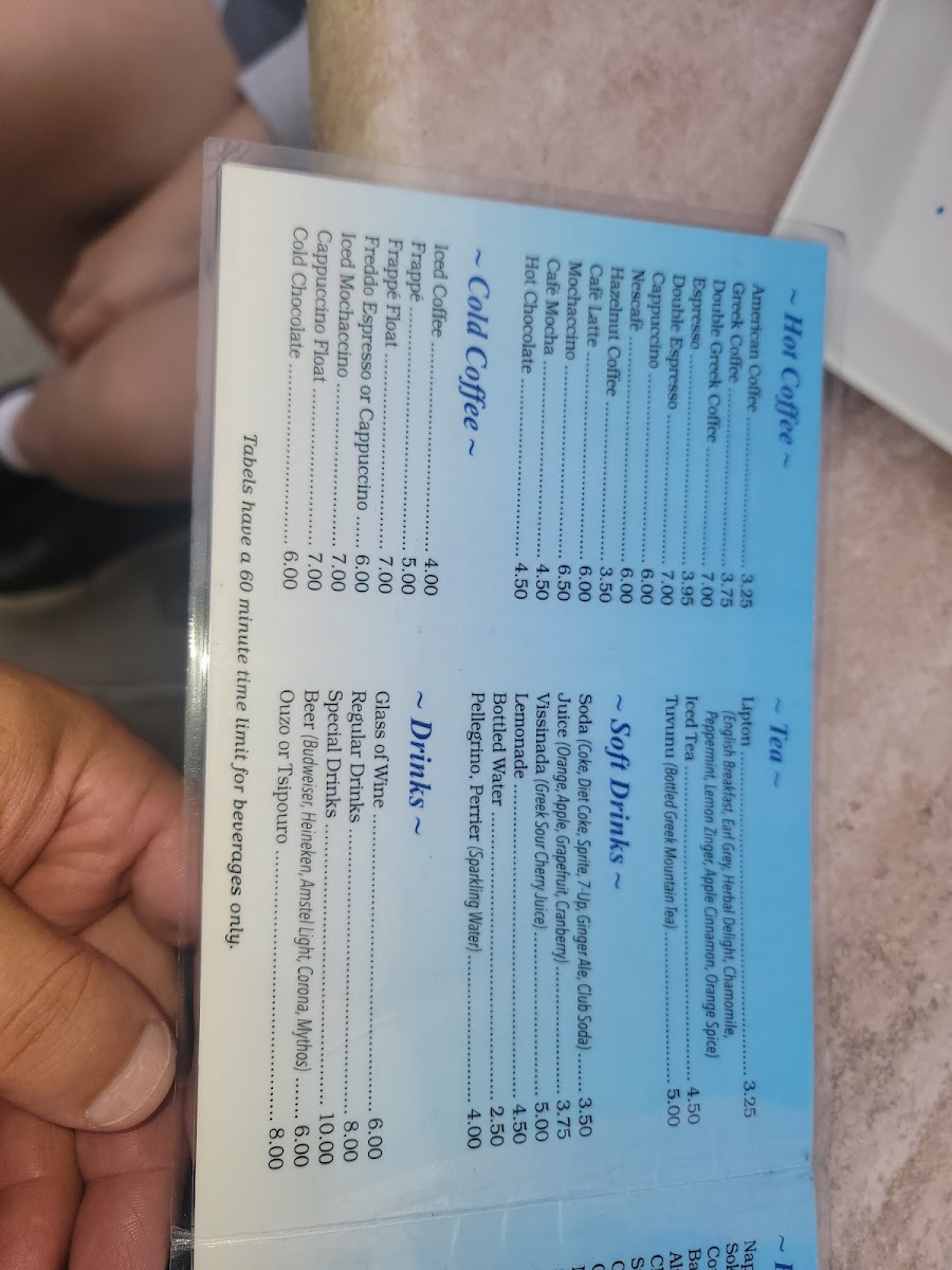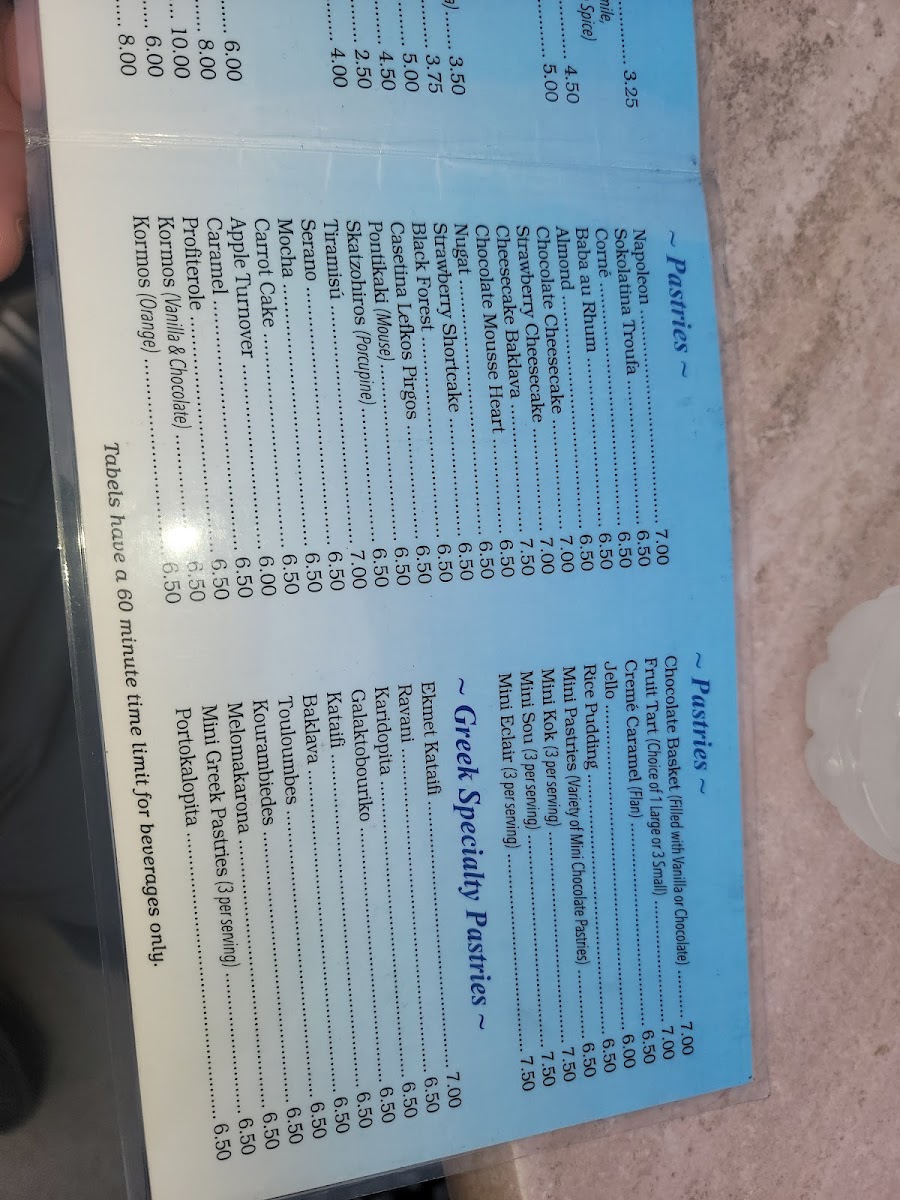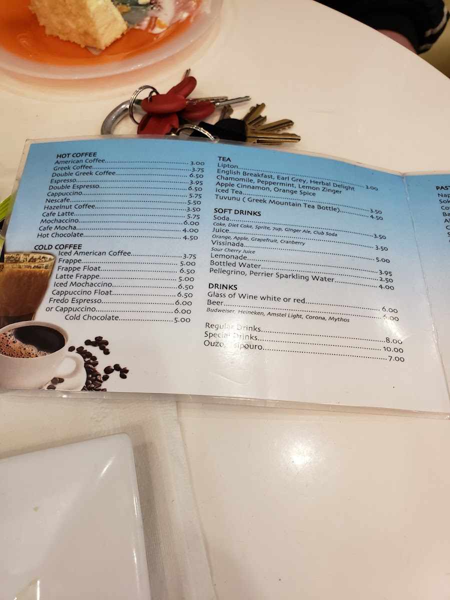 Overall, the menu is structured to accommodate quick orders or casual dining experiences, focusing on classic cafe and Greek dessert offerings alongside a comprehensive coffee and cold beverage list.